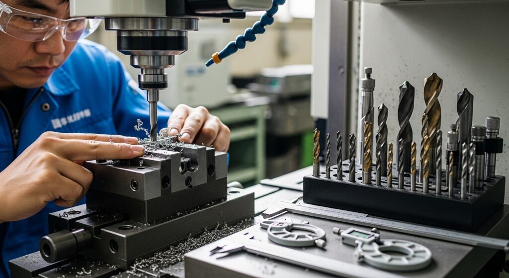 機械は…… 5軸か複合加工機なら穴加工まで1台でできるけど、